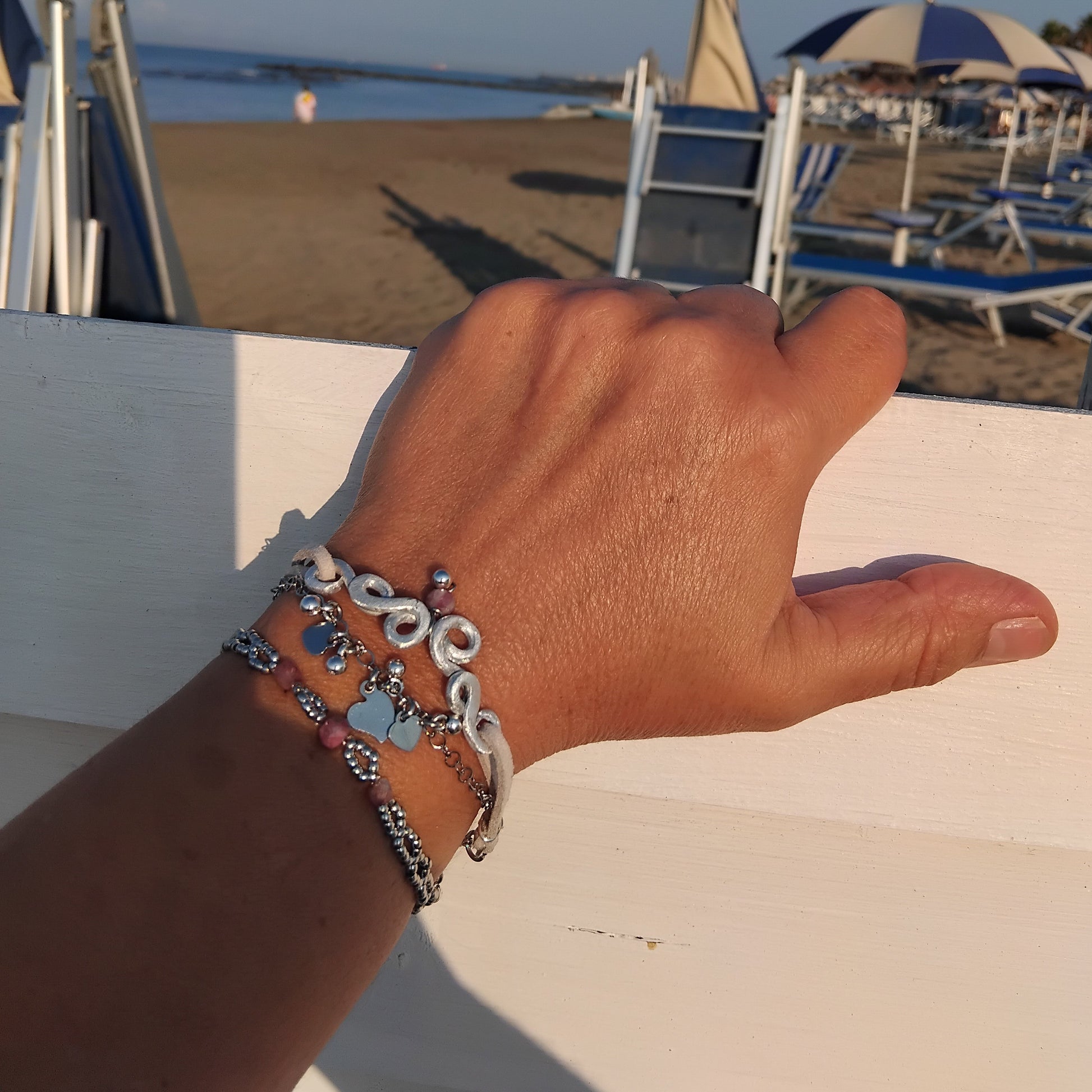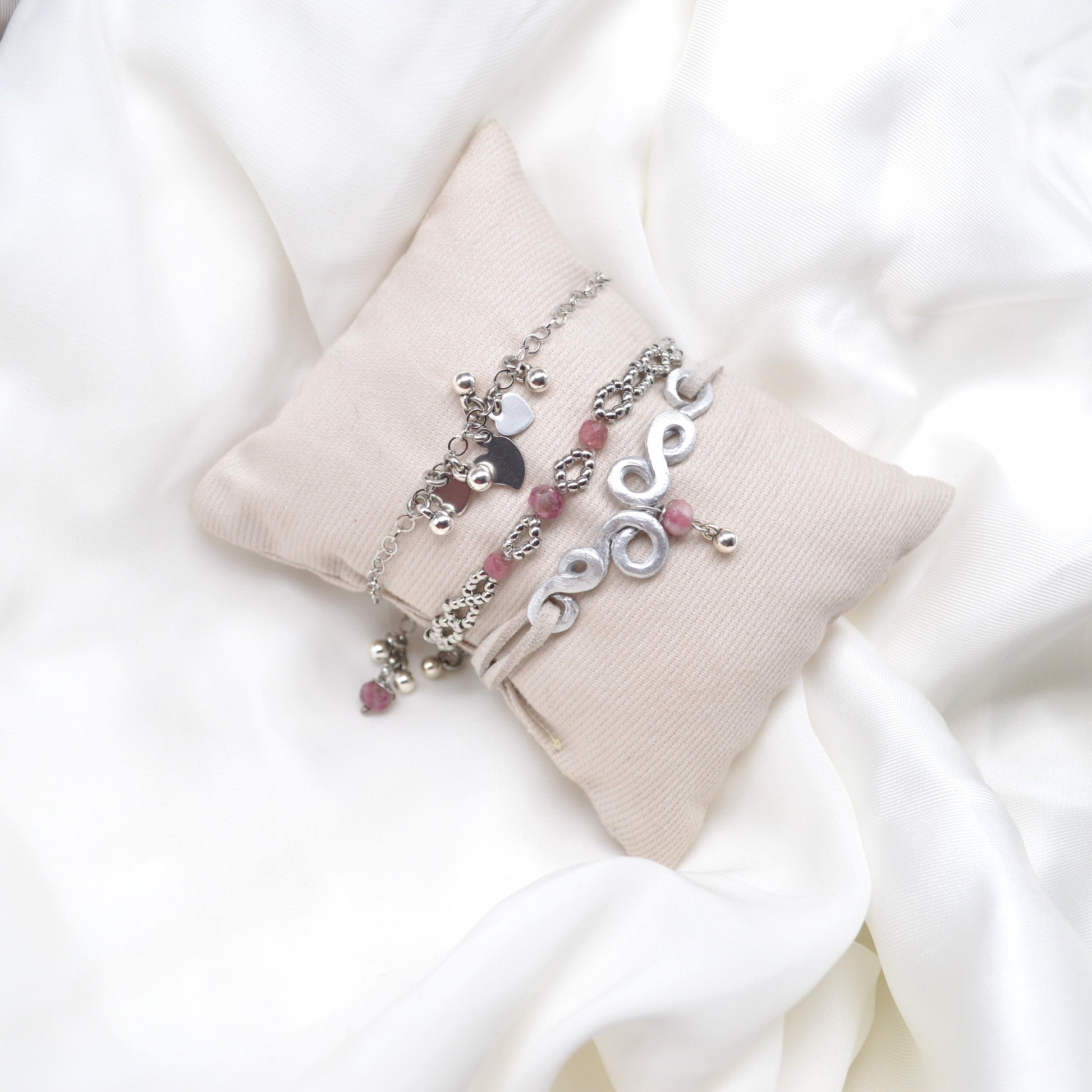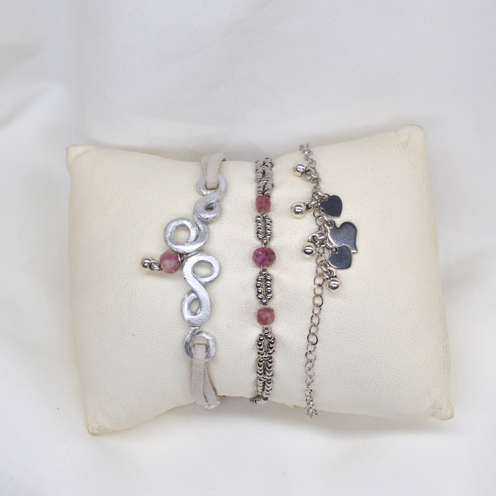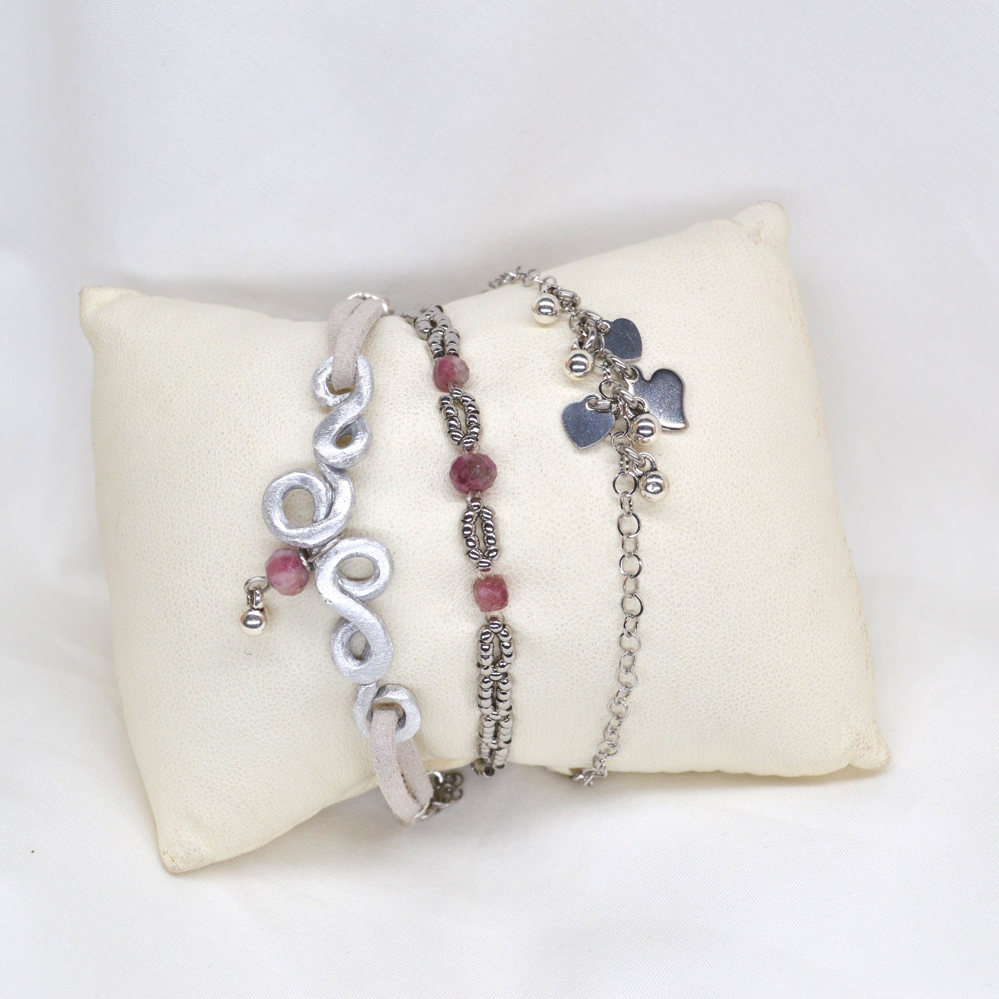 Tris di braccialini in alluminio lavorato a mano e componenti in acciaio inossidabile. Pietre dure inserite: tormalina.