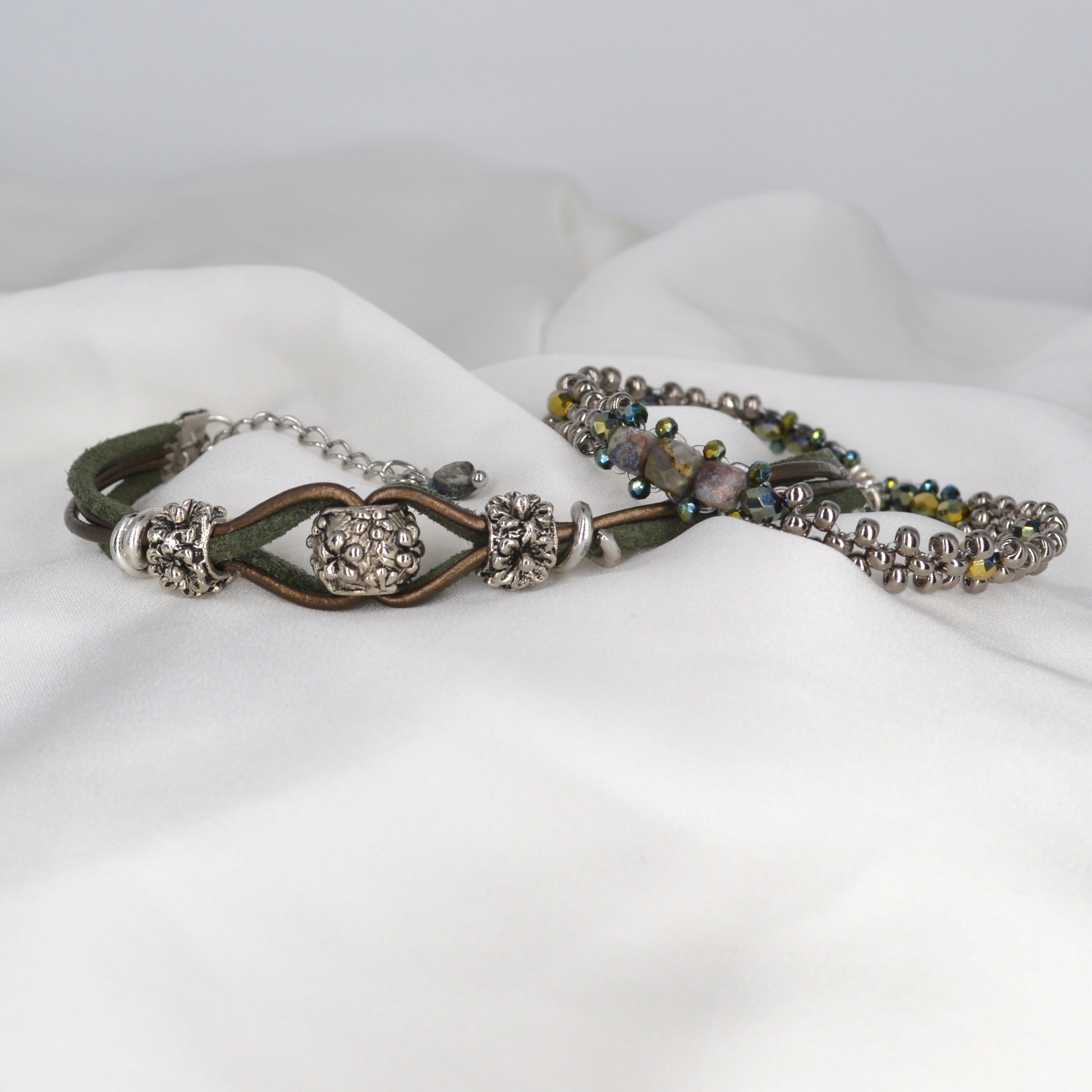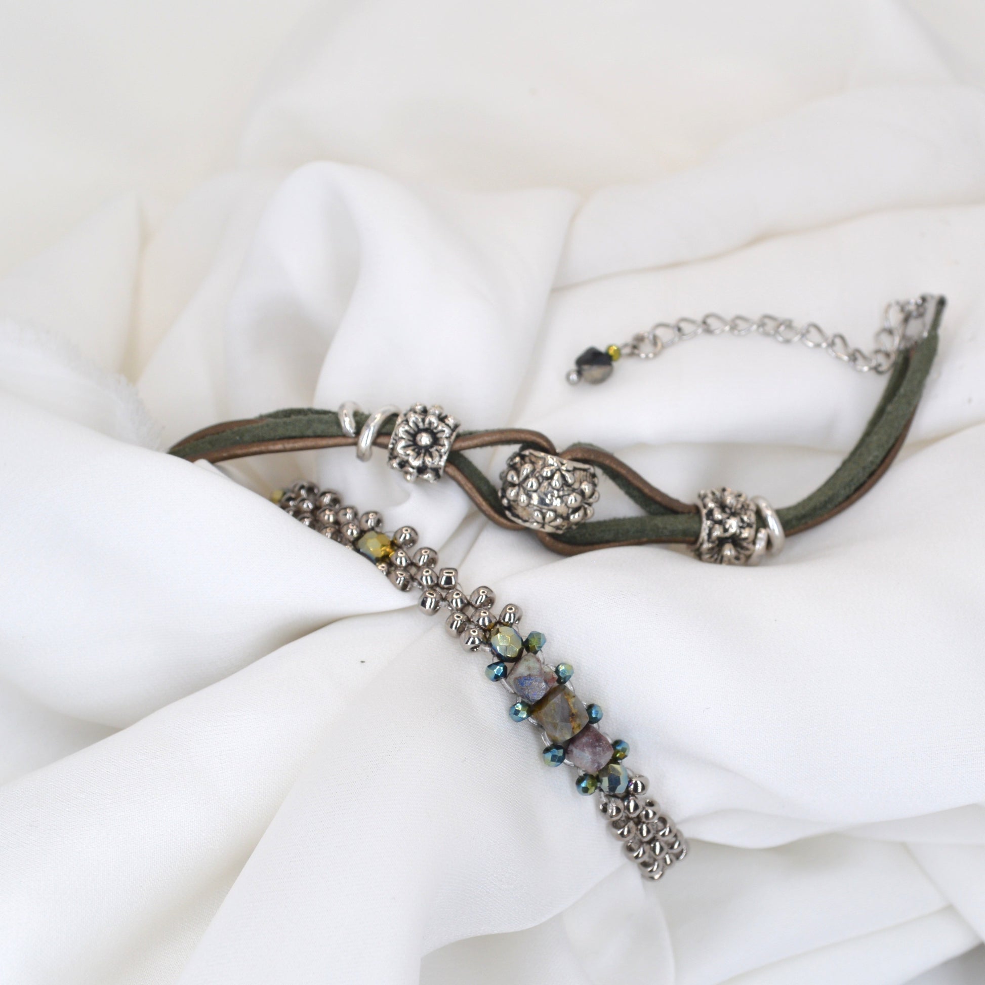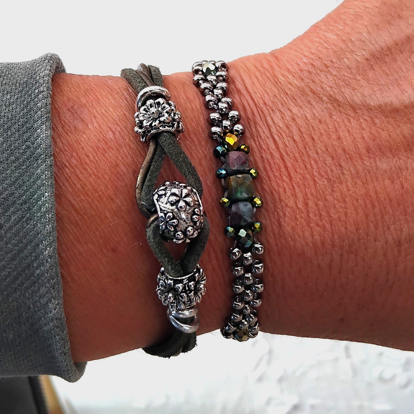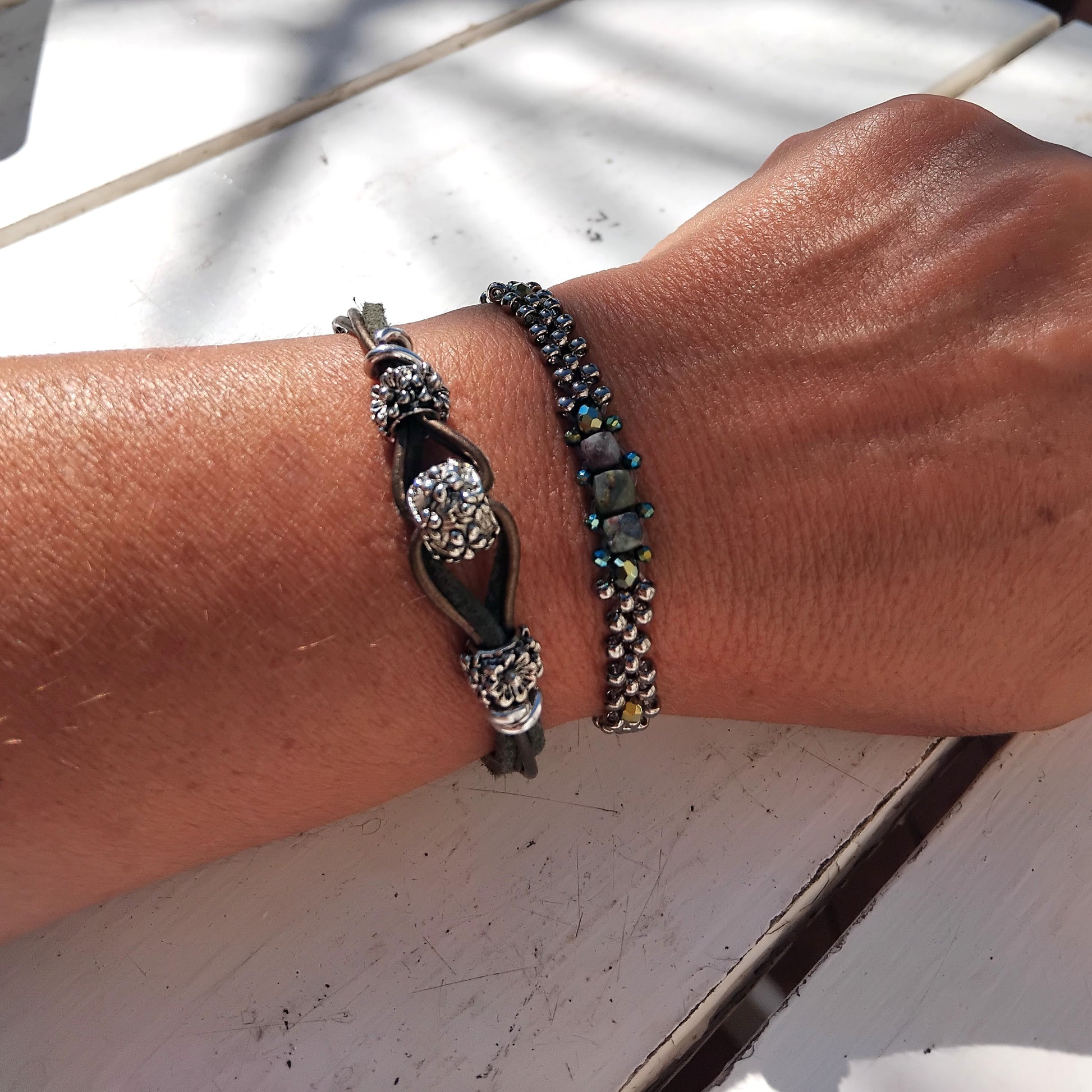 Coppia di bracciali con perline e componenti in argento tibetano. Laccetto in cuoio e alcantara, chiusura regolabile con moschettone in acciaio inossidabile.