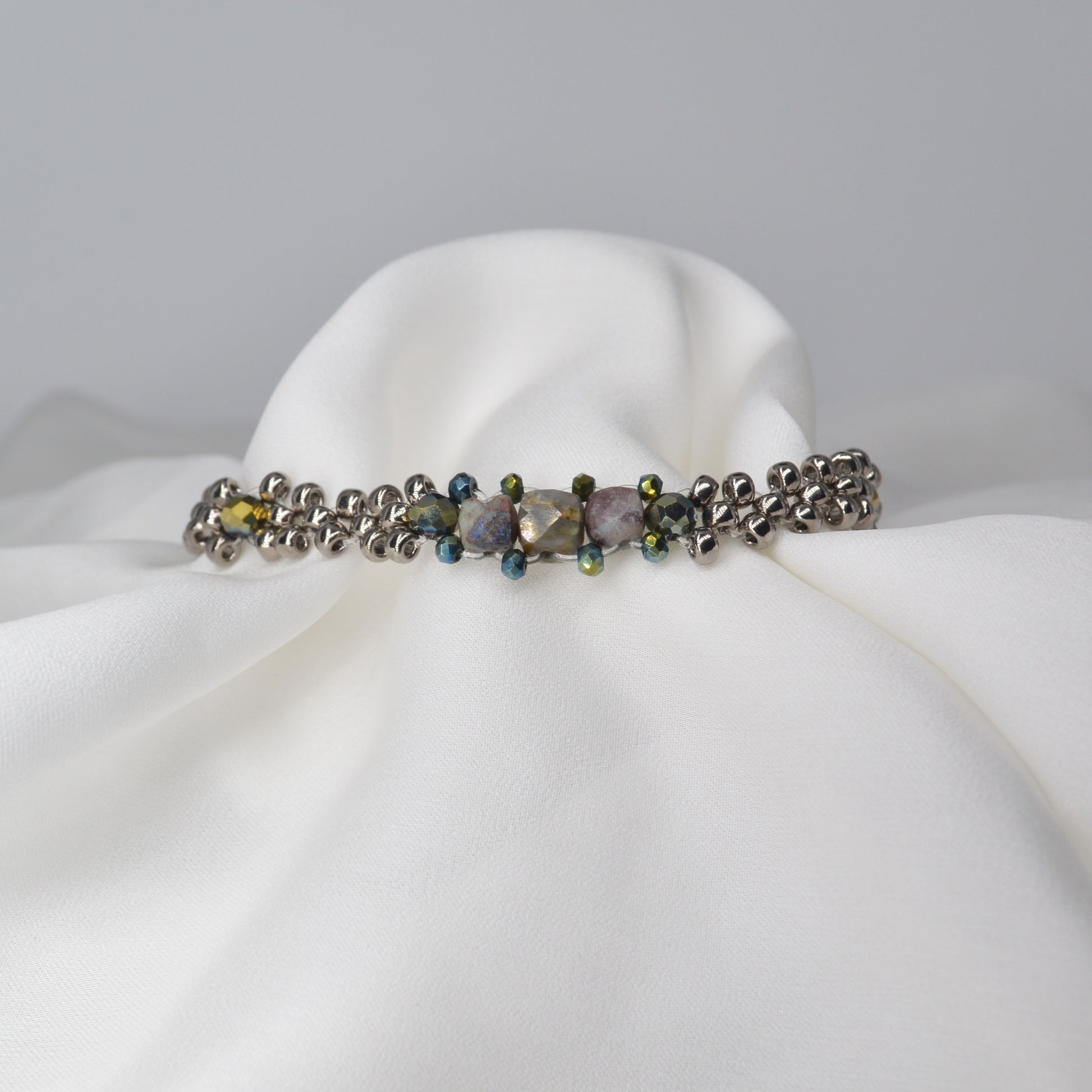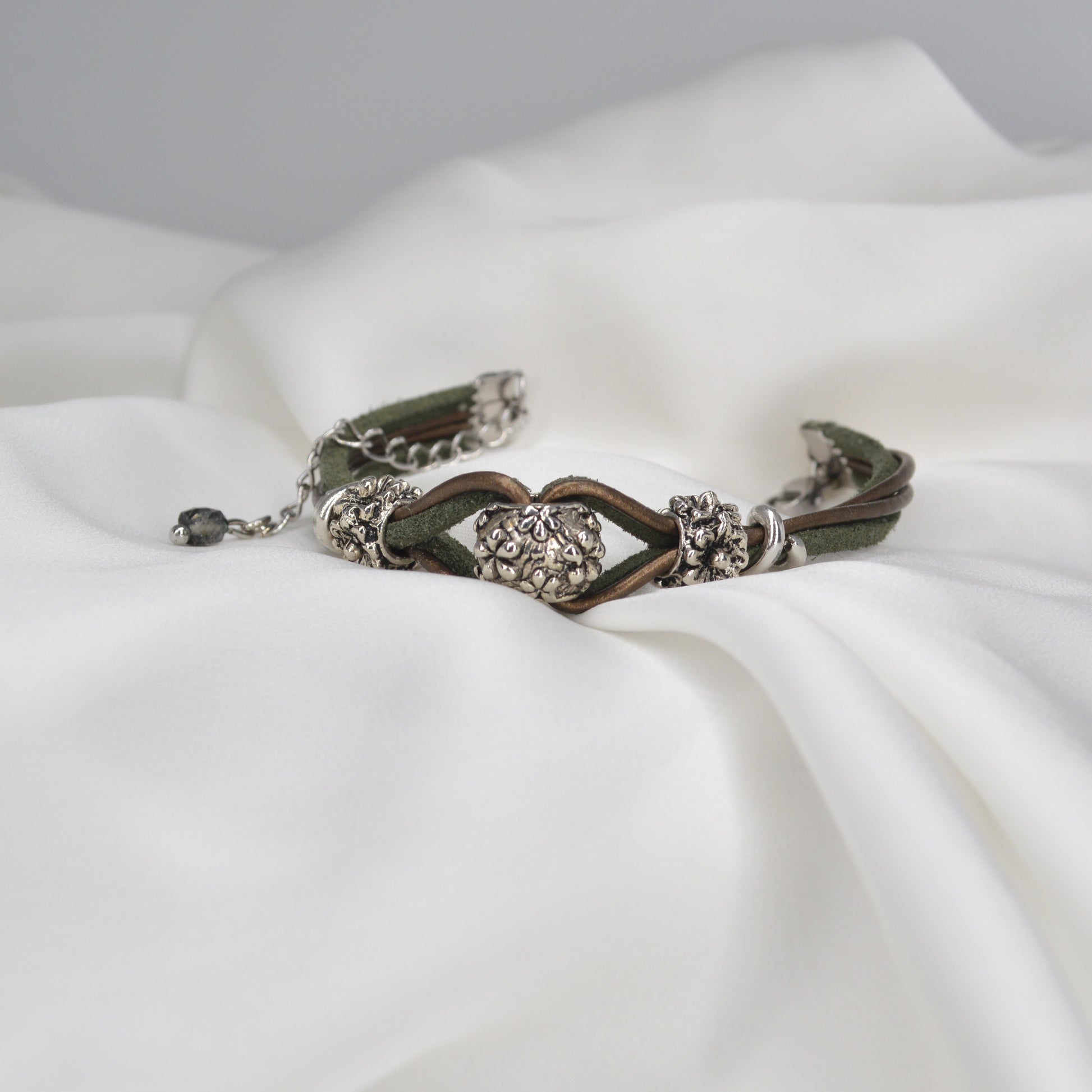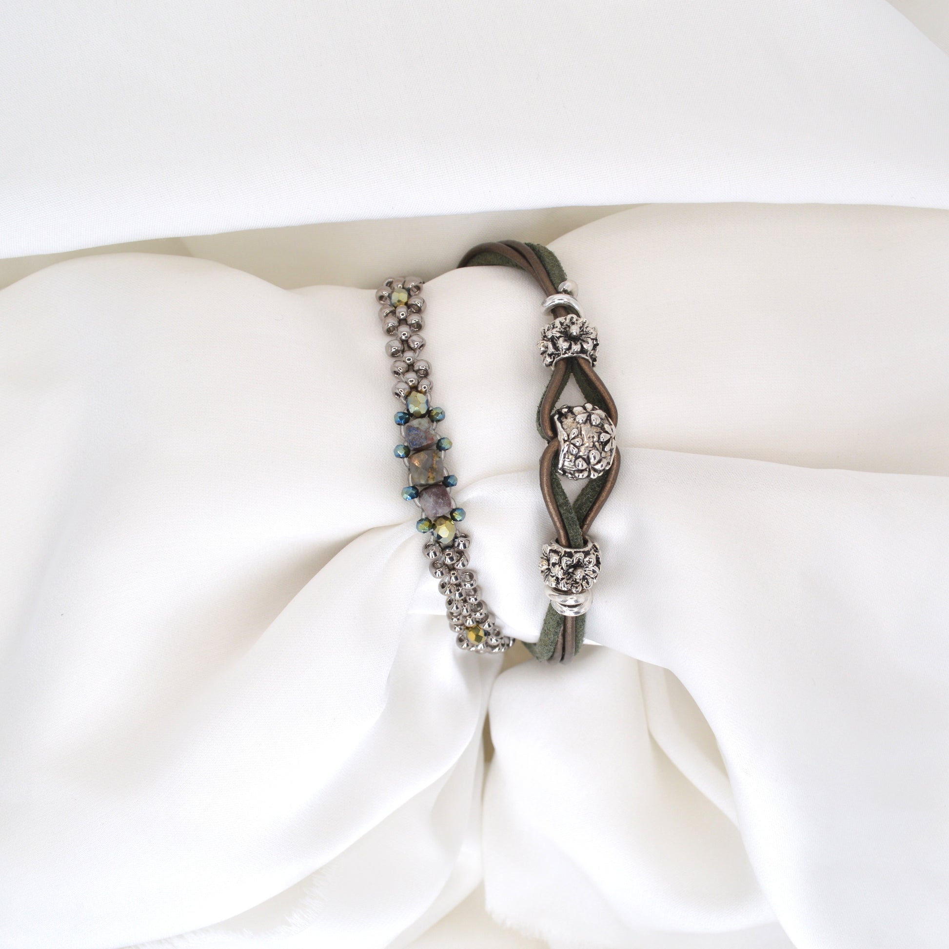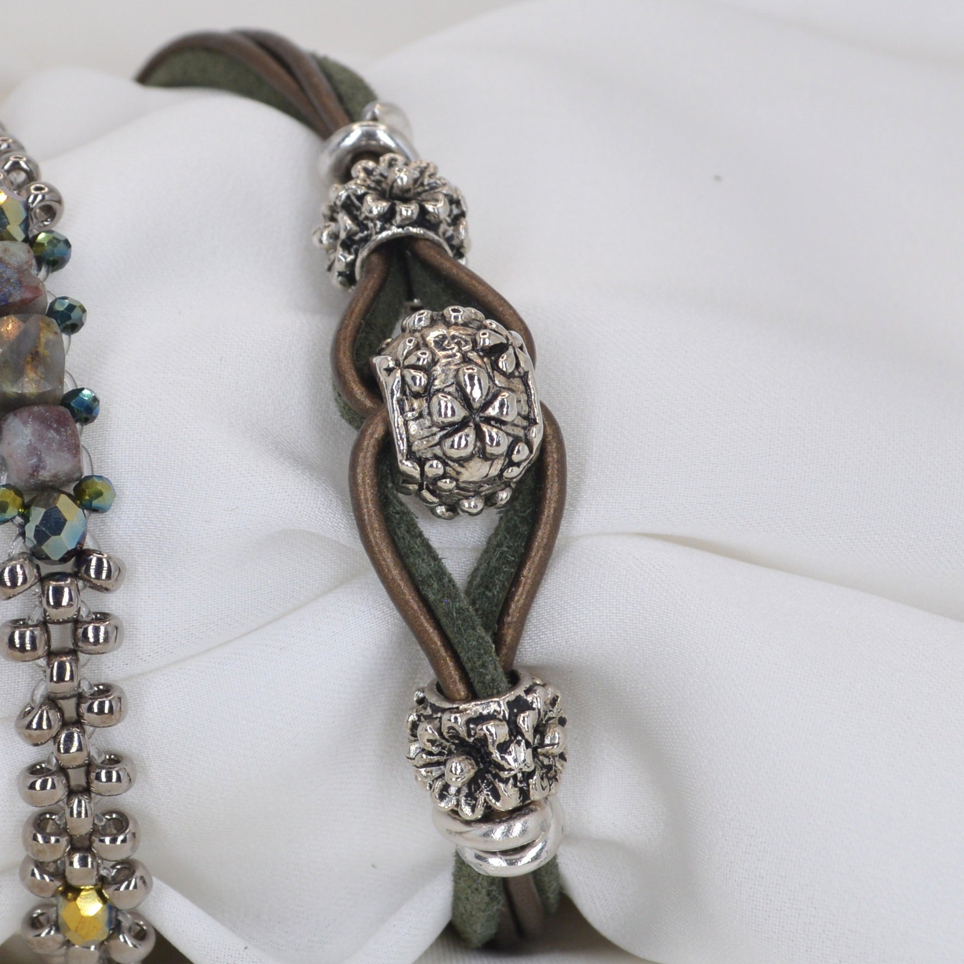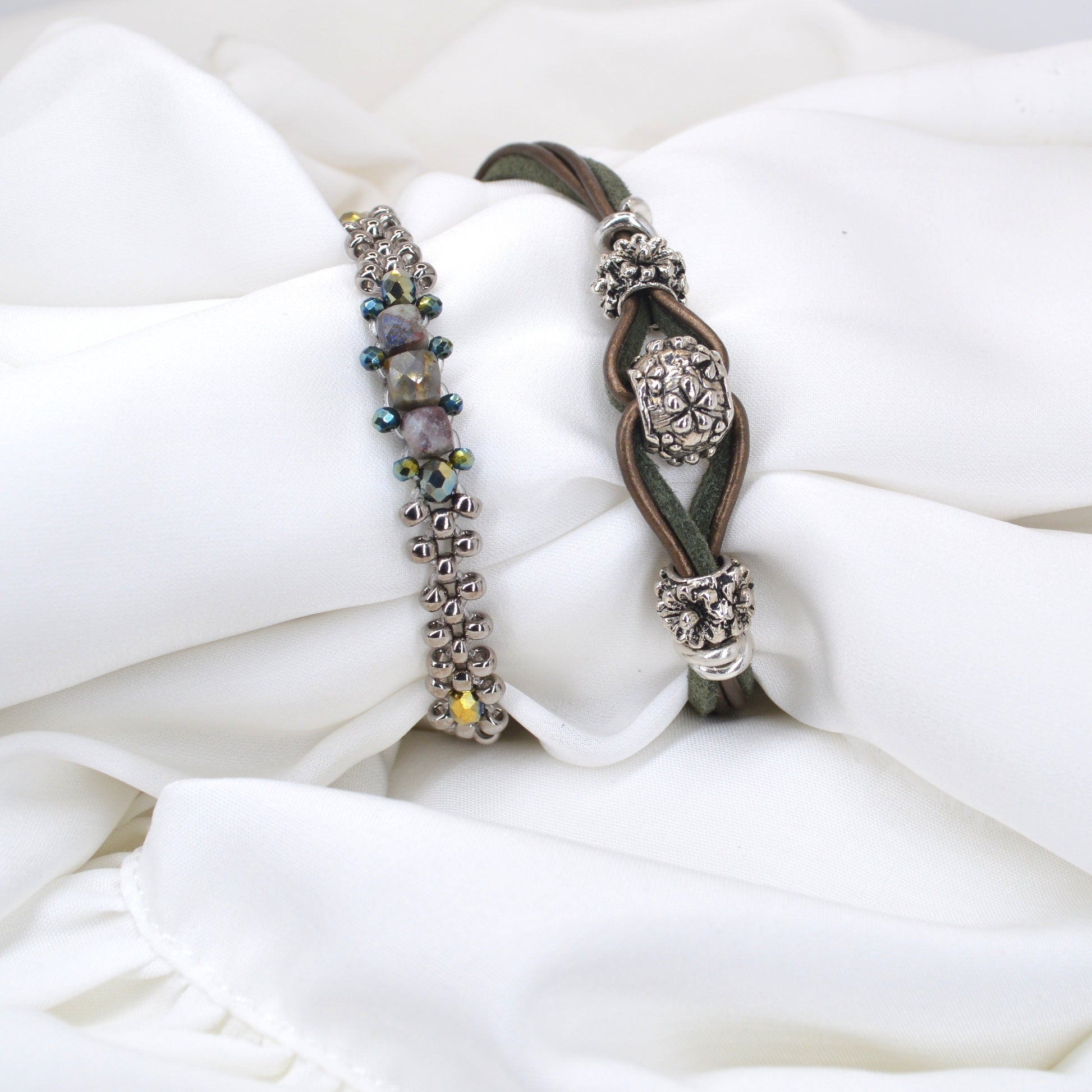 Coppia di bracciali con perline e componenti in argento tibetano. Laccetto in cuoio e alcantara, chiusura regolabile con moschettone in acciaio inossidabile.