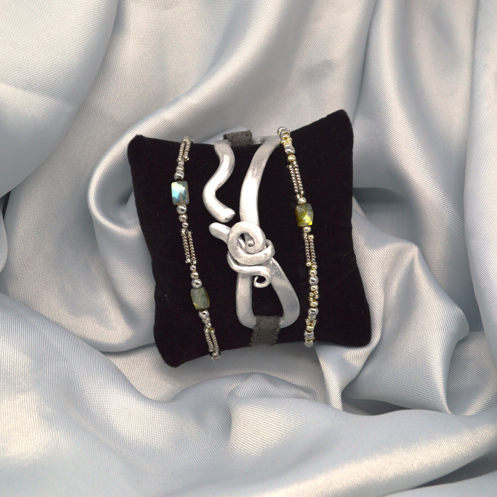 Tris di bracciali: uno in alluminio lavorato a mano, due braccialini elastici in perline e inserti di labradorite. Laccetto di alcantara. Componenti in acciaio inossidabile. Chiusura regolabile con moschettone.