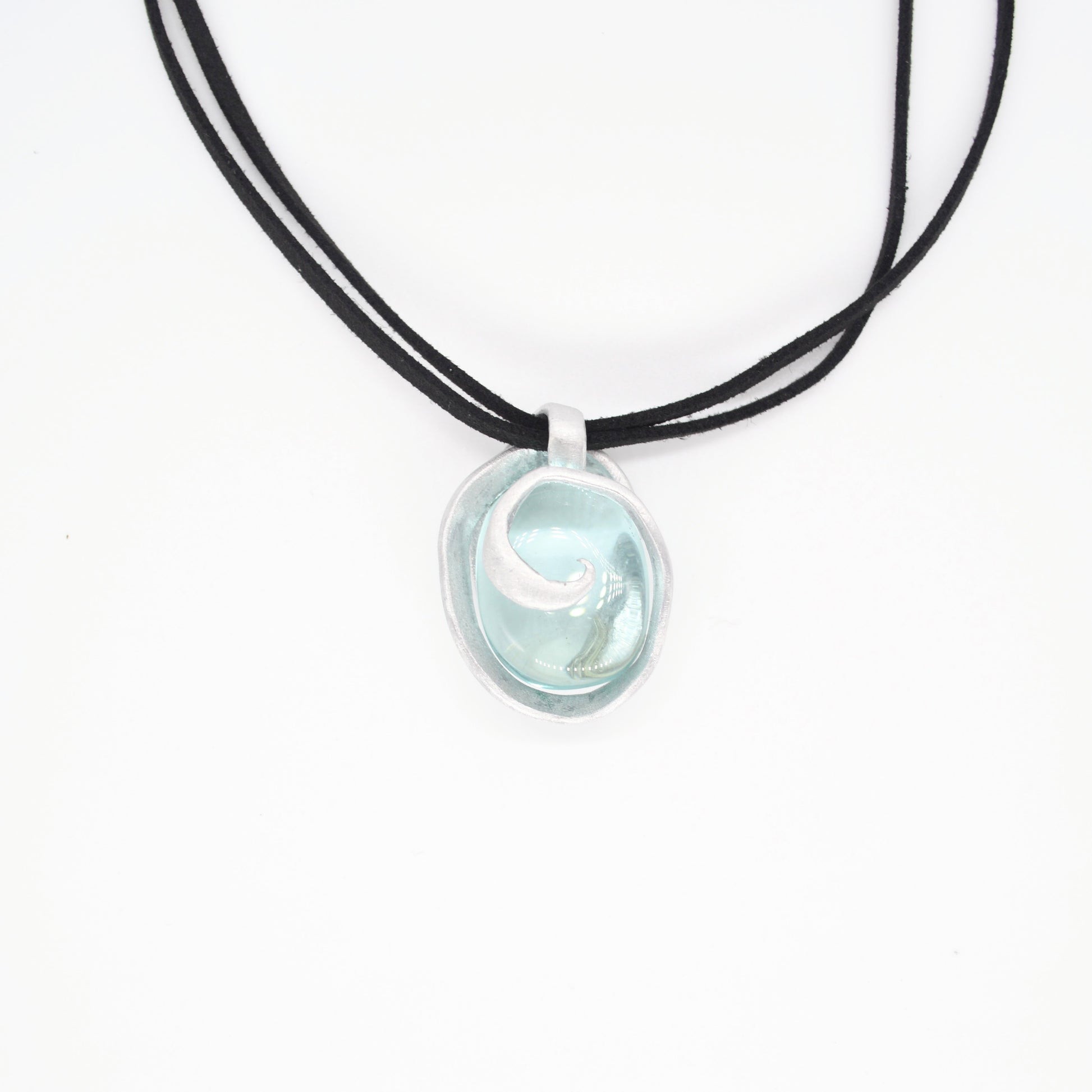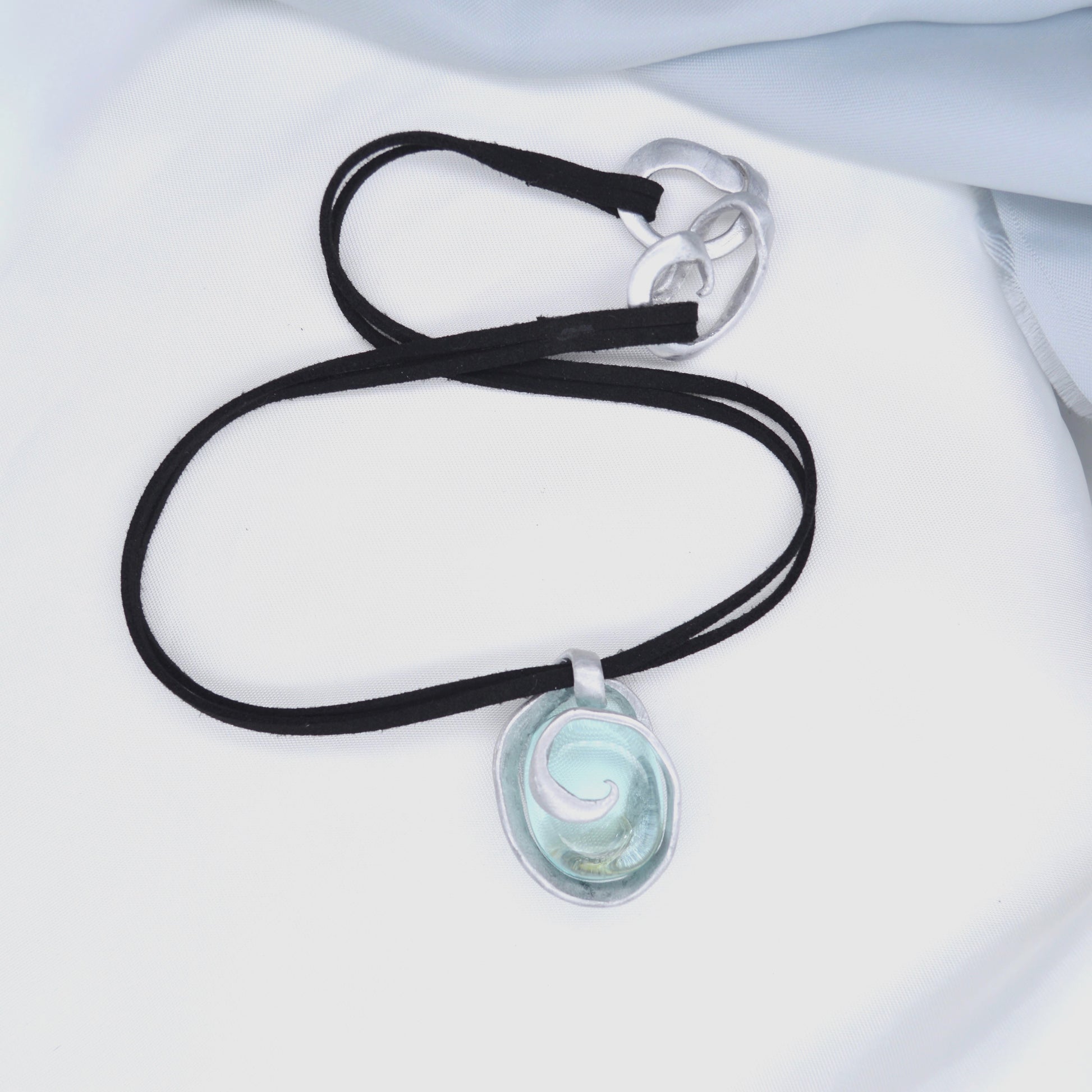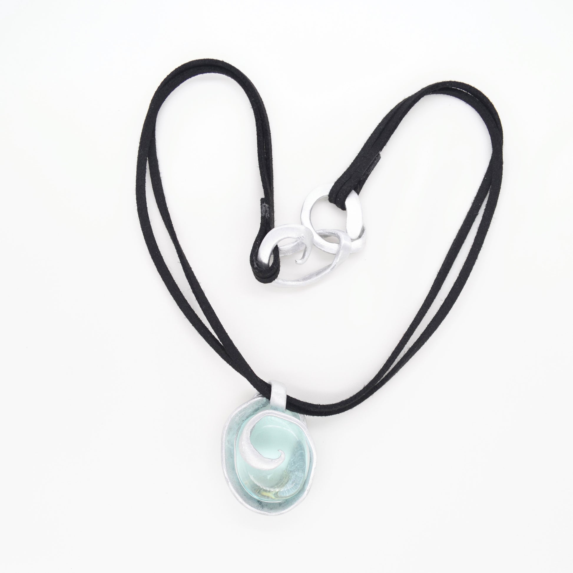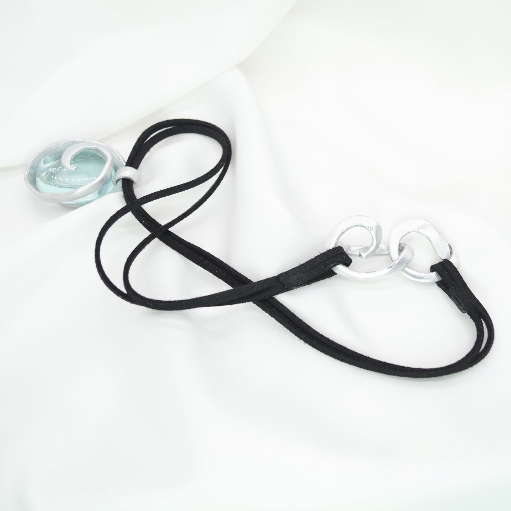 Collana in alluminio lavorato a mano e ossidiana nobile. Laccetto in alcantara. Chiusura realizzata a mano in alluminio. Pezzo unico