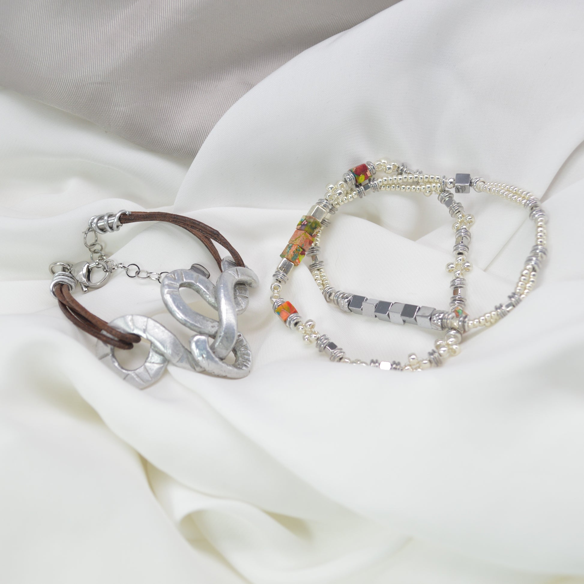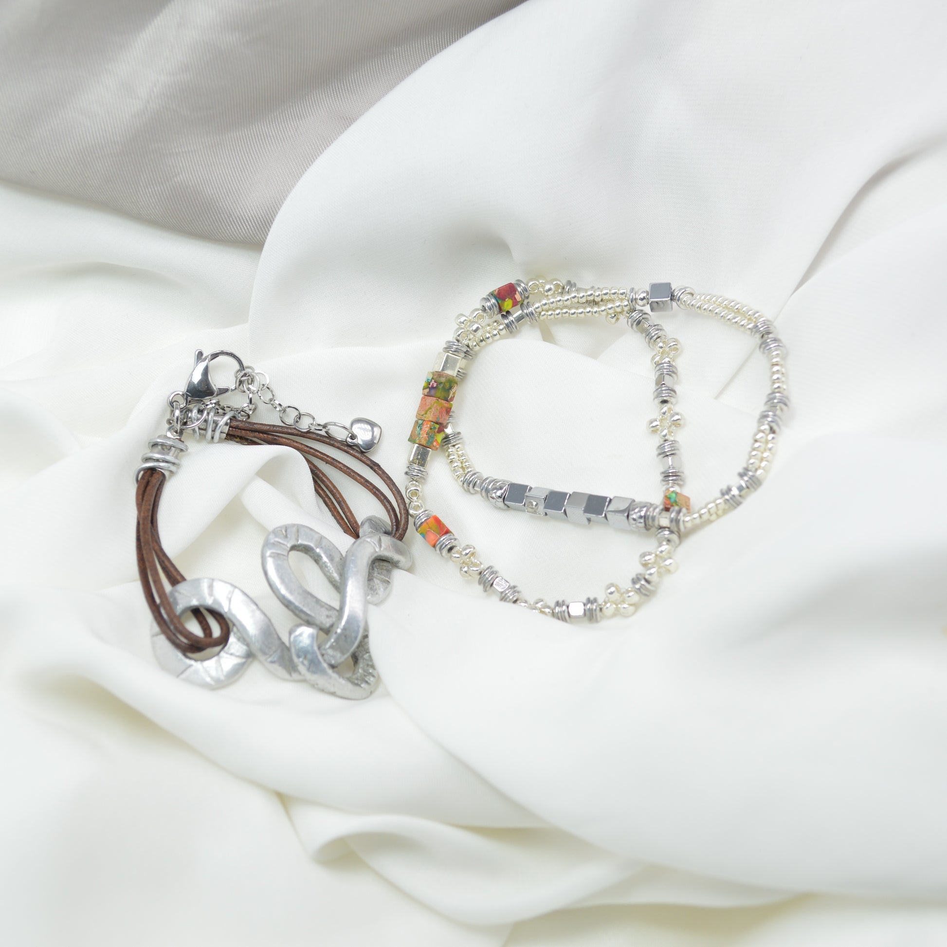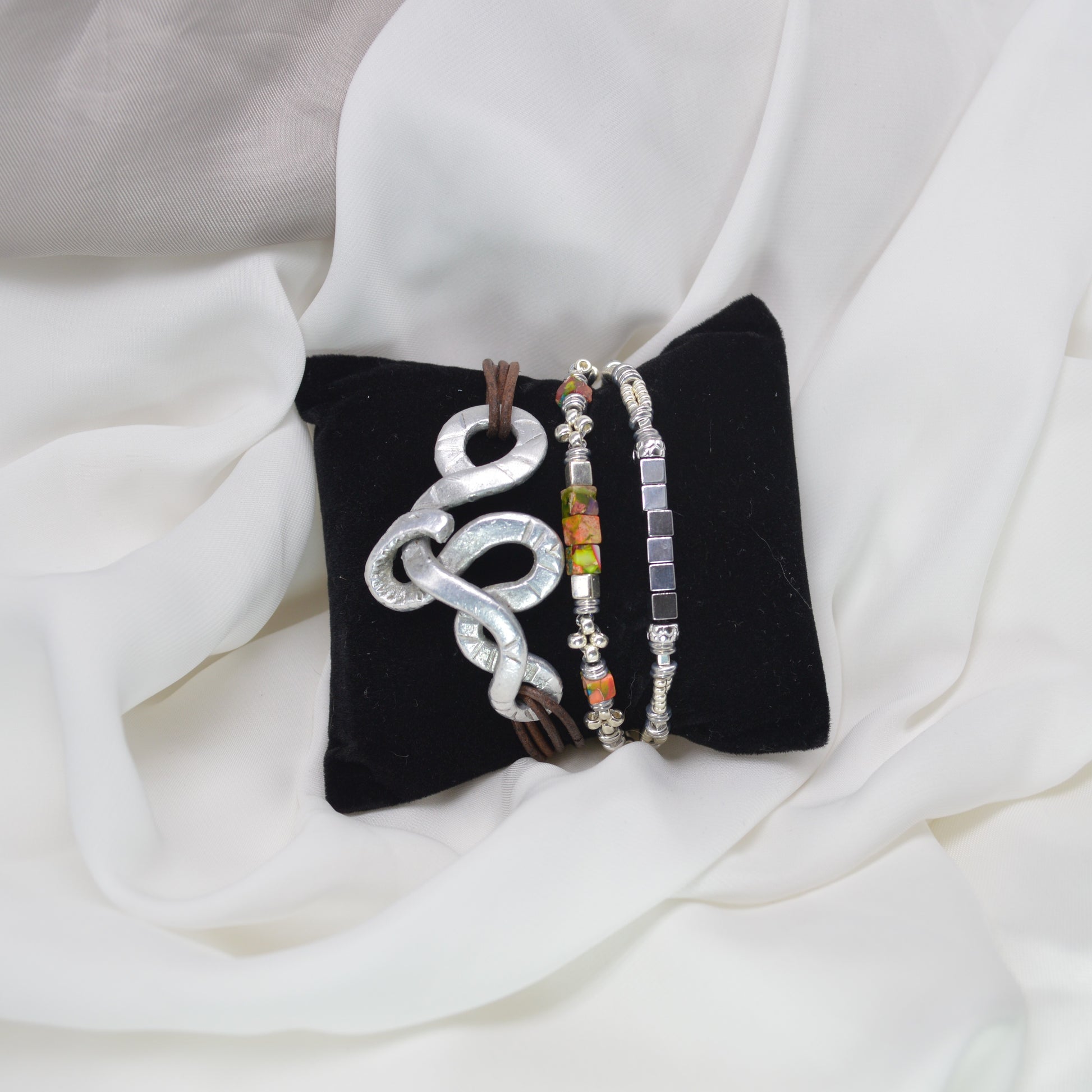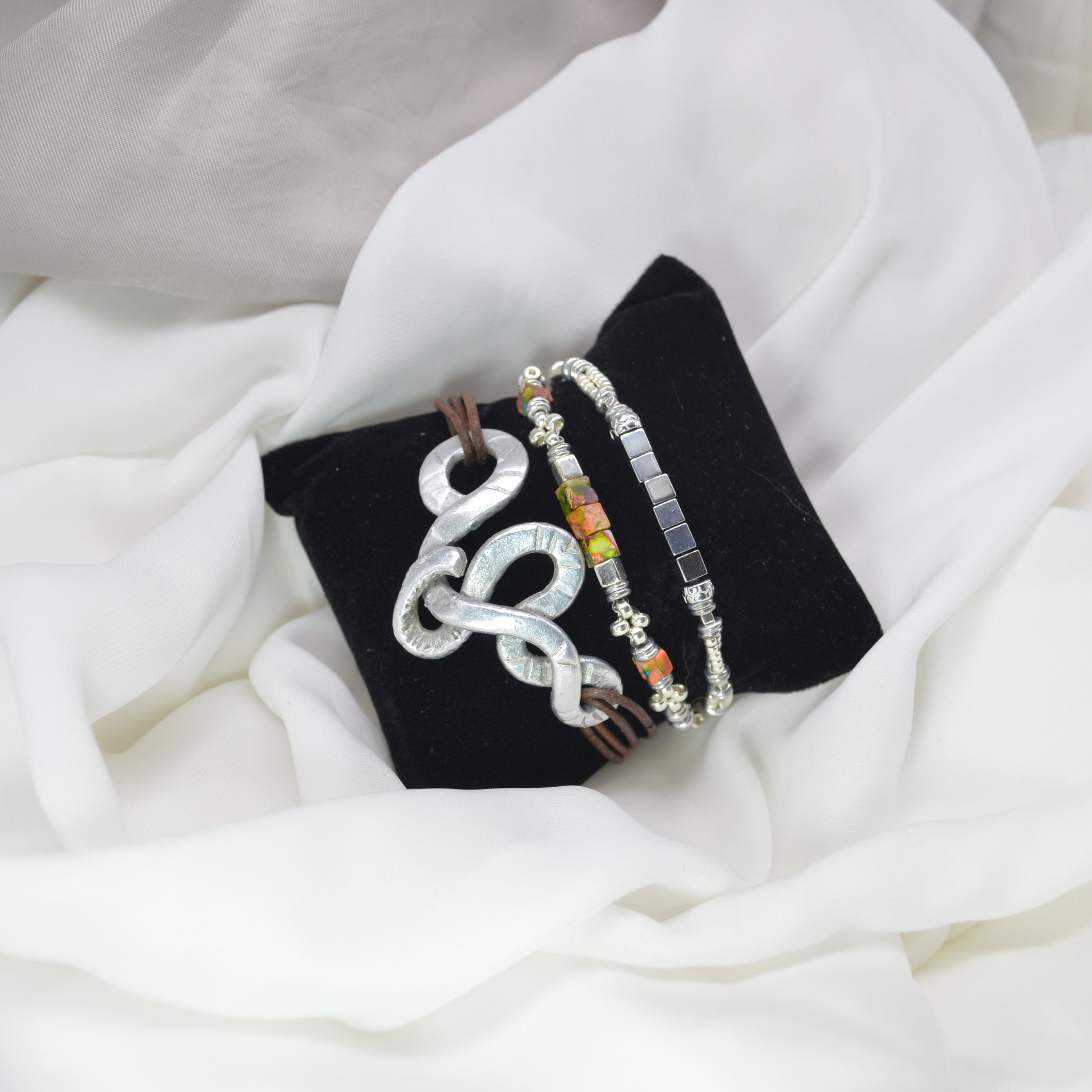 Tris di bracciali in alluminio , cordino in cuoio, chiusura con moschettone in acciaio inossidabile. Due braccialini con ematite, diaspro Picasso e perline, elastici.